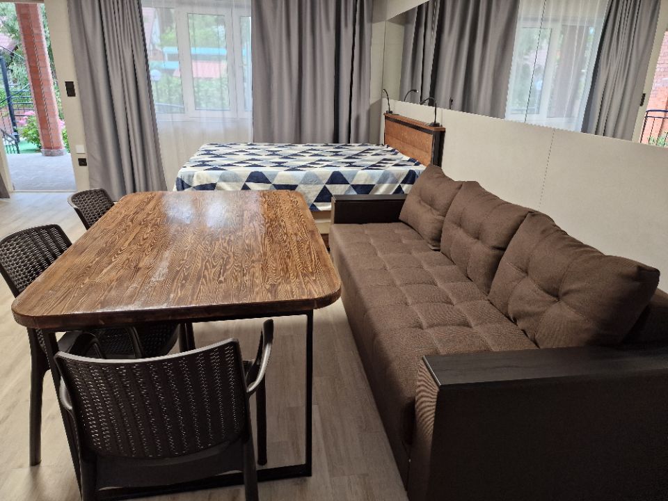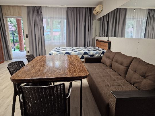 Комфортная студия 23 квадратных метра в Вашем распоряжении! Красивый интерьер, две полноценные двуспальные кровати и веранда с обеденным столом